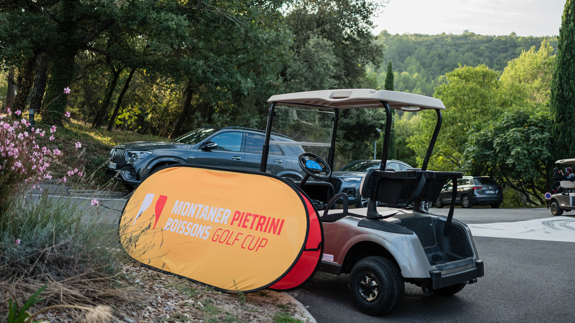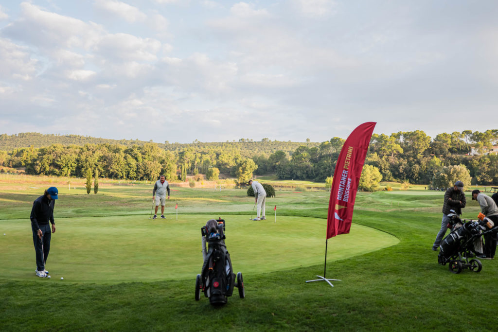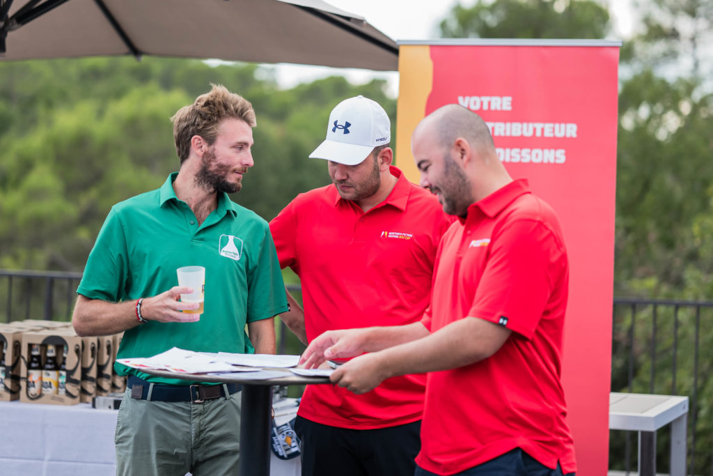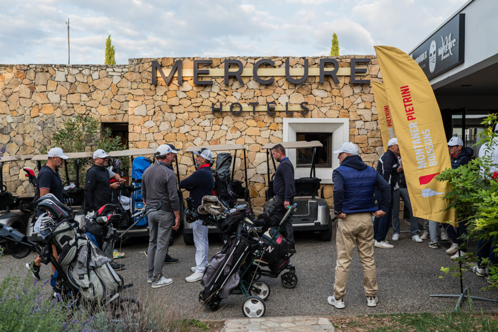 Un peu plus en détails : invitations, chevalets, golf banner, jetons marque balle, polos, casquettes, photocall…