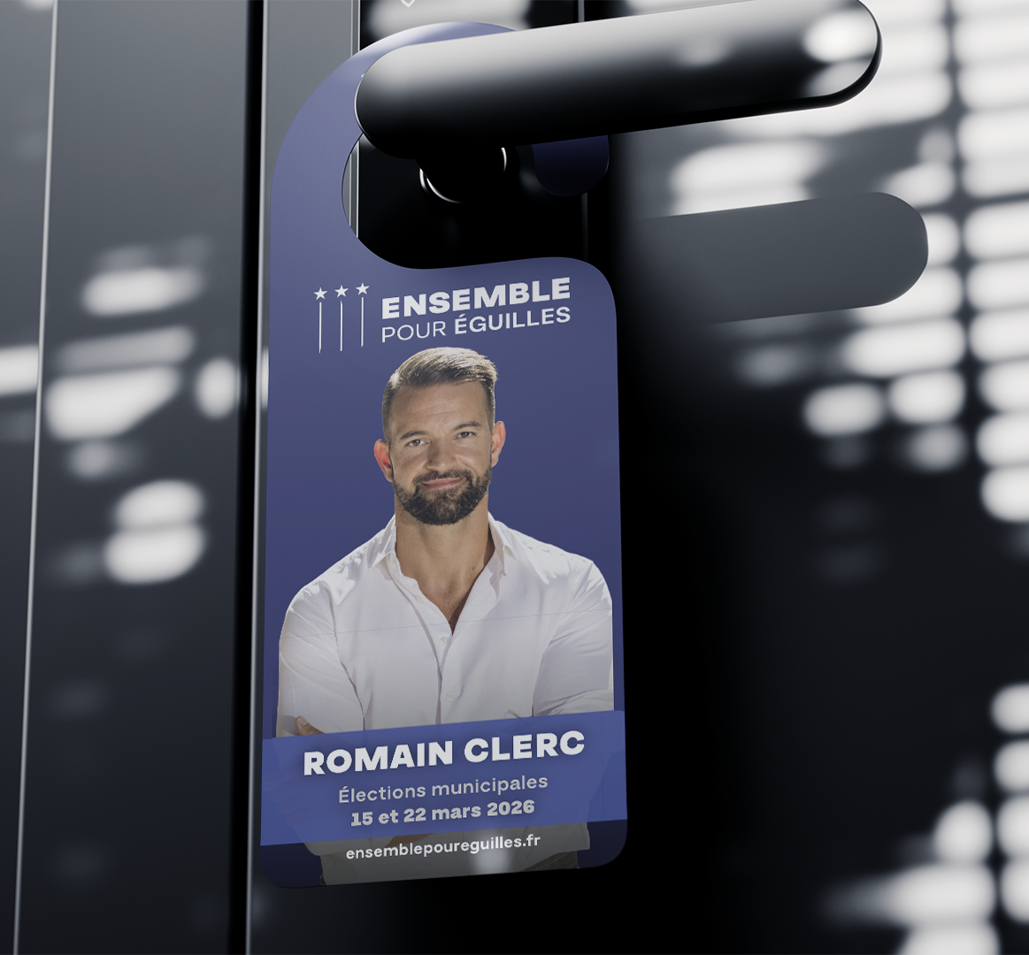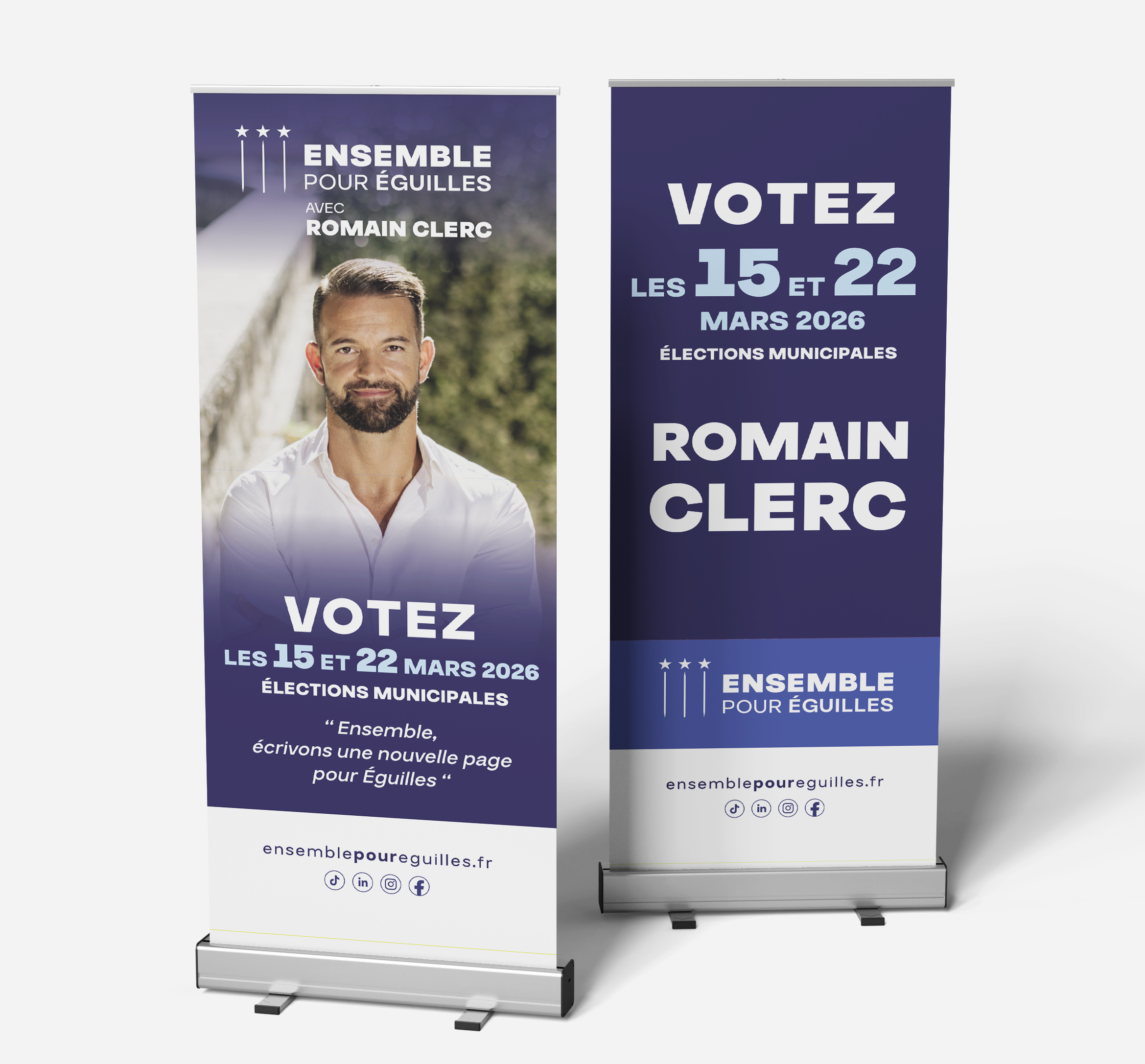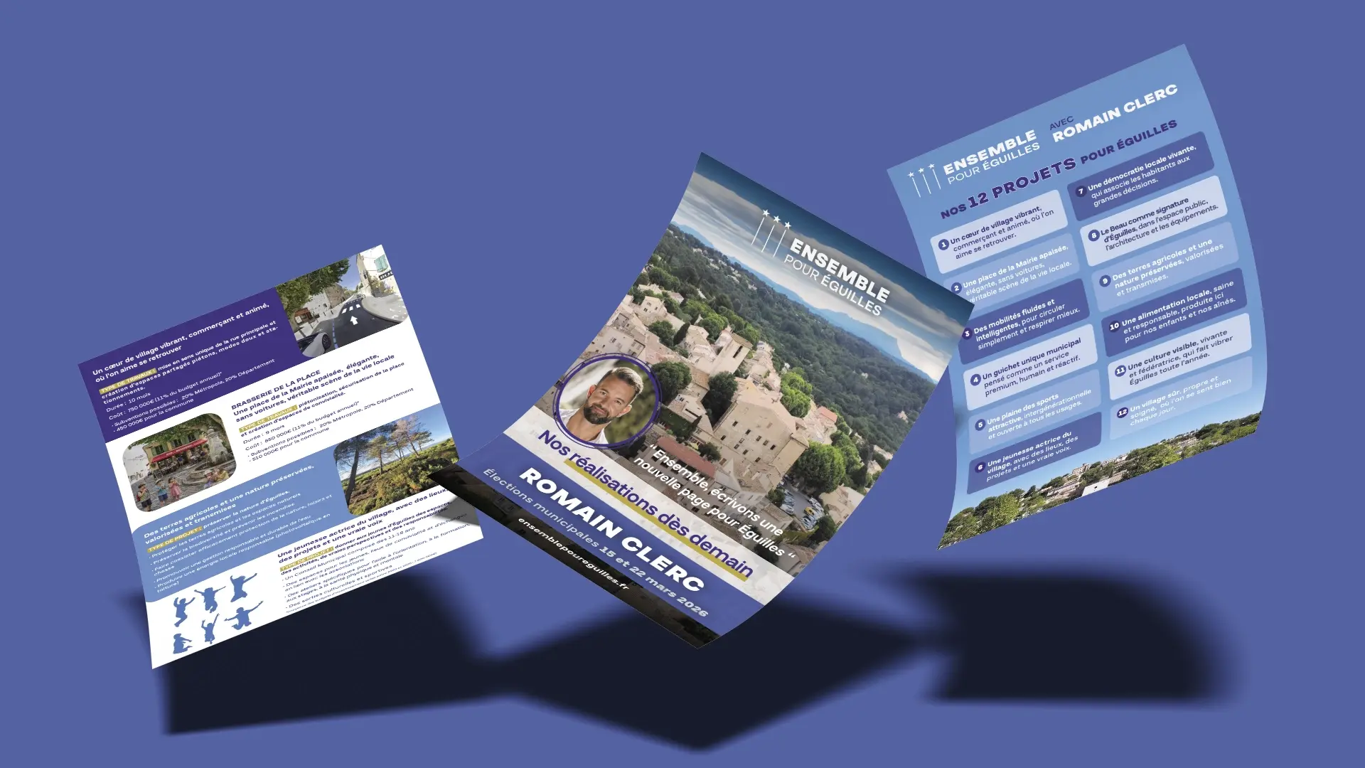 Accompagnement en communication, création de l’identité visuelle de la liste « Ensemble pour Éguilles » et réalisation de l’ensemble des supports de campagne (print, digitaux, événementiels et documents officiels) pour le candidat Romain Clerc dans le cadre des élections municipales 2026 à Éguilles.